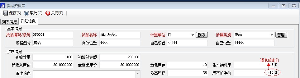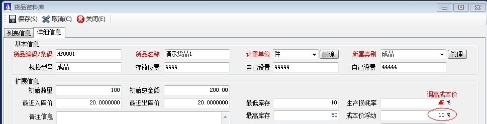 生產(chǎn)耗損率:就是指每生產(chǎn)100個(gè)貨品當(dāng)中,有多少個(gè)損壞的產(chǎn)品,那么就在耗損率這里設(shè)置,比如:每生產(chǎn)貨品A100個(gè),當(dāng)中就會(huì)損壞3個(gè),那么耗損率這里,我們?cè)O(shè)置3%。成本價(jià)浮動(dòng):浮動(dòng)率這里有兩種情況,第一,調(diào)高成本,第二,調(diào)低成本。比如:我們需要調(diào)高貨品A的成本10%,那么成本價(jià)浮動(dòng)這里就設(shè)置10%。相反我們要調(diào)低貨品A10%的成本,那么成本價(jià)浮動(dòng)這里就設(shè)置-10%。