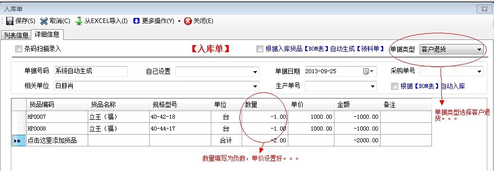 做入庫單,數(shù)量填寫為負(fù)數(shù)(退貨給供應(yīng)商的數(shù)量),單價(jià)填寫好,單據(jù)類型選擇退貨。保存即可。。。