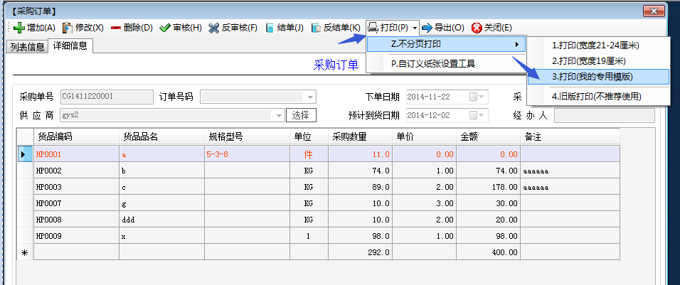 第一步:點(diǎn)采購(gòu)管理-采購(gòu)訂單,隨便找到一張采購(gòu)訂單,然后切換到詳細(xì)信息界面,點(diǎn)打?。业讲Ⅻc(diǎn)擊[我的專用模版]