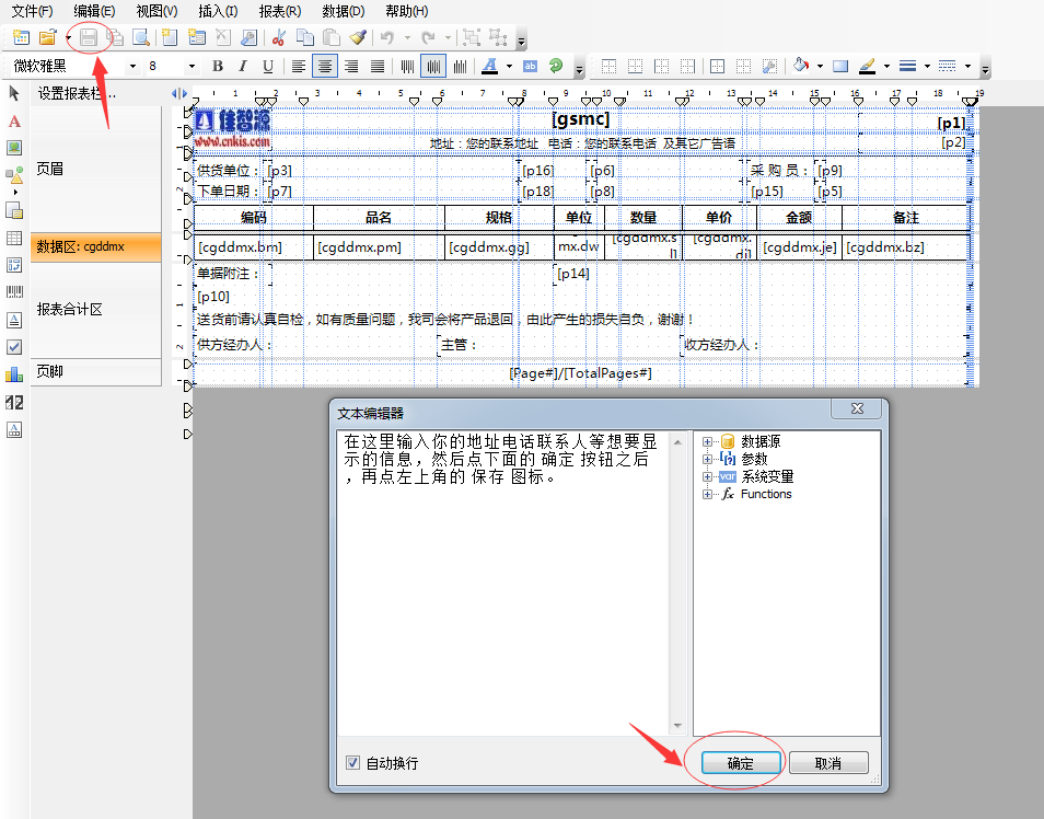 第三步:在打印模版設(shè)計(jì)界面,用鼠標(biāo)雙擊要修改的“聯(lián)系地址電話”這個(gè)位置,然后在彈出來(lái)的文本編輯框內(nèi),填寫好你想要顯示的文字,之后點(diǎn)擊[確認(rèn)]按鈕,關(guān)閉編輯窗口。