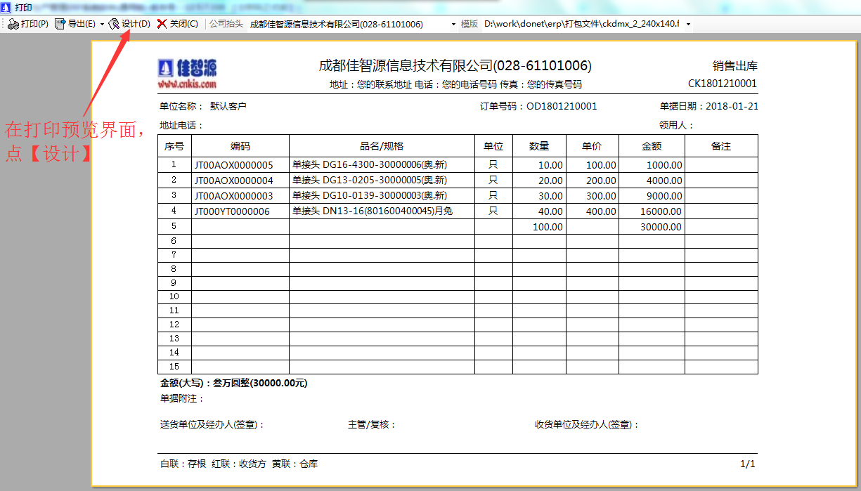 第一步:在打印預(yù)覽界面,點(diǎn)上面的【設(shè)計(jì)】按鈕。(點(diǎn)擊圖片可以查看清晰大圖