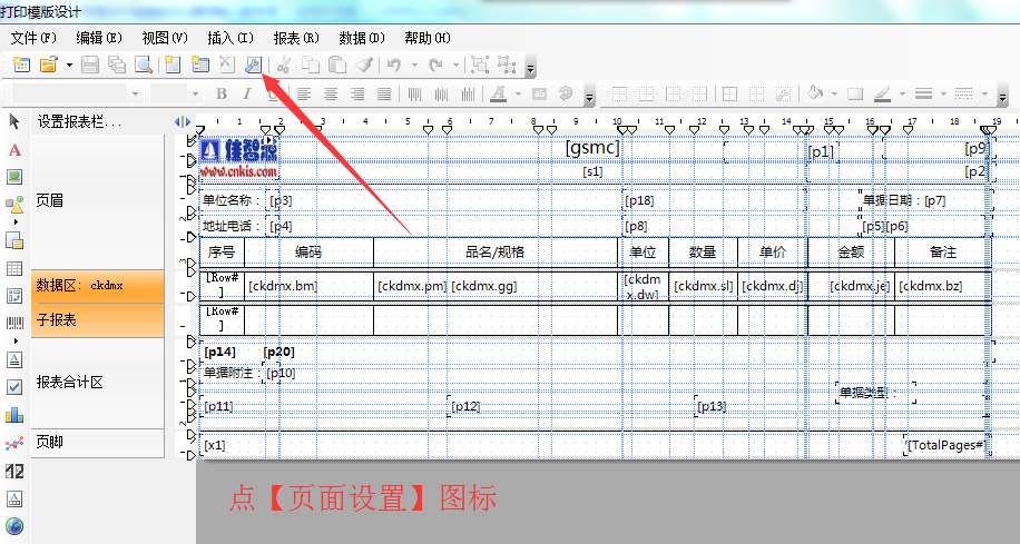 第二步:在打印模版設(shè)計(jì)界面,點(diǎn)上方的【頁(yè)面設(shè)置】圖標(biāo)。