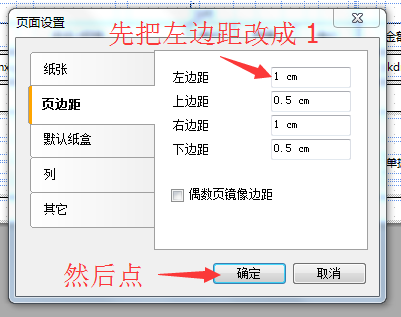 第四步:將【左邊距】參數(shù)修改為 1 cm  然后點(diǎn)擊下面的【確定】按鈕。