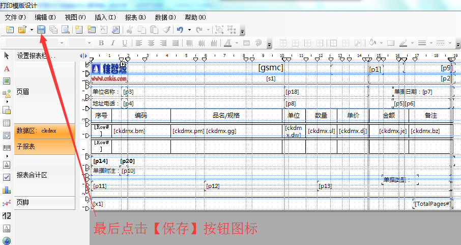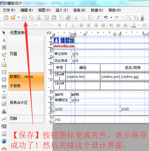 第六步:【保存】按鈕圖標(biāo)變成灰色,表示保存成功了。接下來(lái),點(diǎn)擊右上方的【X】關(guān)閉按鈕,關(guān)掉模版設(shè)計(jì)界面。