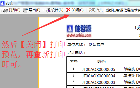 第七步:繼續(xù)點(diǎn)【關(guān)閉】按鈕,關(guān)掉打印預(yù)覽界面,然后重新再點(diǎn)擊單據(jù)上的【打印】按鈕進(jìn)行打印就可以了。