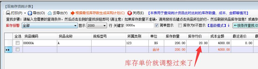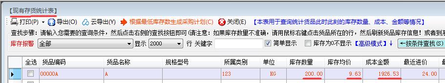 以貨品A為例,現(xiàn)有存貨查詢統(tǒng)計表,查詢結果顯示,當前庫存數(shù)量200,庫存均價9.63,成本金額1926.53 ,徦如現(xiàn)在我們覺得這個9.63的單價是不對的,我想把它改成20   ,具體的操作步驟如下: