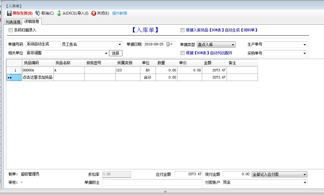 第三步:做“入庫單”,相關單位選擇“庫存調整”,單據(jù)類型選擇“盤點入庫”,然后選擇好貨品A,數(shù)量填寫0,單價不填,金額填寫為相關金額(2073.47),之后,保存并審核。