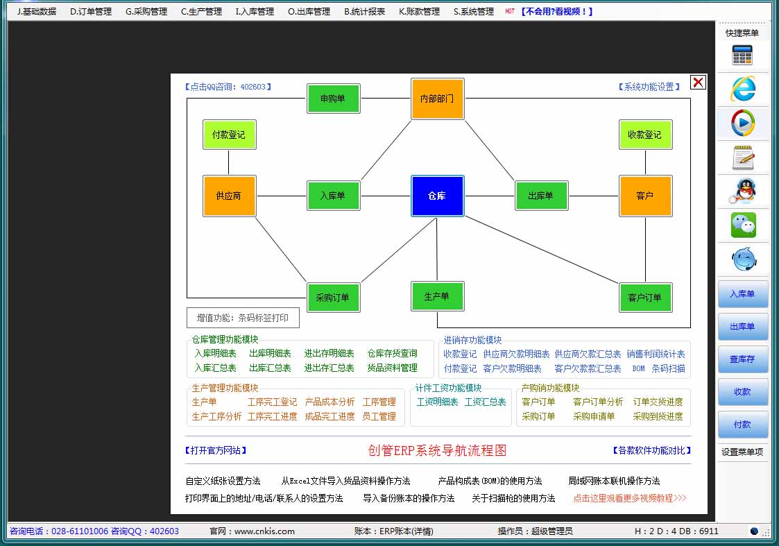 企管王生產(chǎn)管理ERP系統(tǒng)軟件(通用版)是一款非常優(yōu)秀且通用性極強(qiáng)的倉(cāng)庫(kù)貨品/物料/商品出入庫(kù)管理的小型ERP軟件系統(tǒng),適用于食品、服裝、保健品、電子、貿(mào)易、物資、化妝品、電器等工業(yè)、商業(yè)、貿(mào)易等各領(lǐng)域的企業(yè)、商鋪、個(gè)人。生產(chǎn)企業(yè)中的原材料采購(gòu)入庫(kù)、生產(chǎn)發(fā)料領(lǐng)料;批發(fā)零售公司的商品采購(gòu)入庫(kù)、領(lǐng)用出庫(kù)、銷(xiāo)售發(fā)貨;辦公室物品保管、分發(fā)、借出、歸還等都可以進(jìn)行管理。。