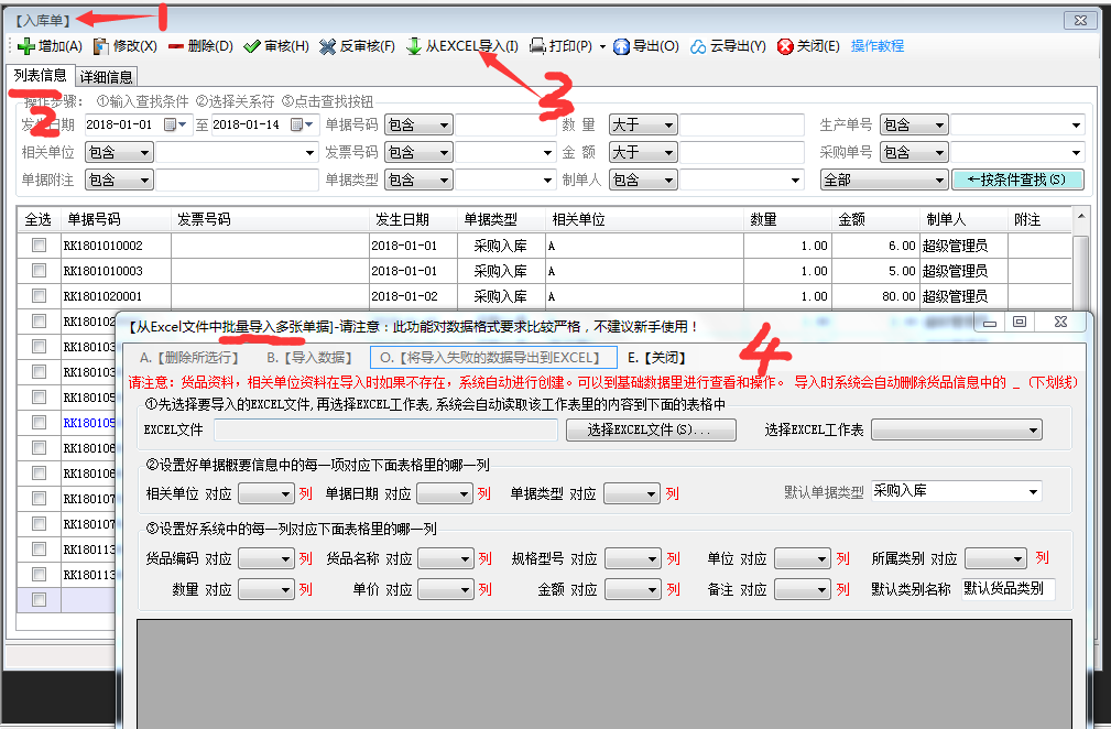 現在我們先來看一下批量導入功能在哪里。EXCEL批量導入單據按鈕的位置是在入庫單或者出庫單據的列表信息界面。