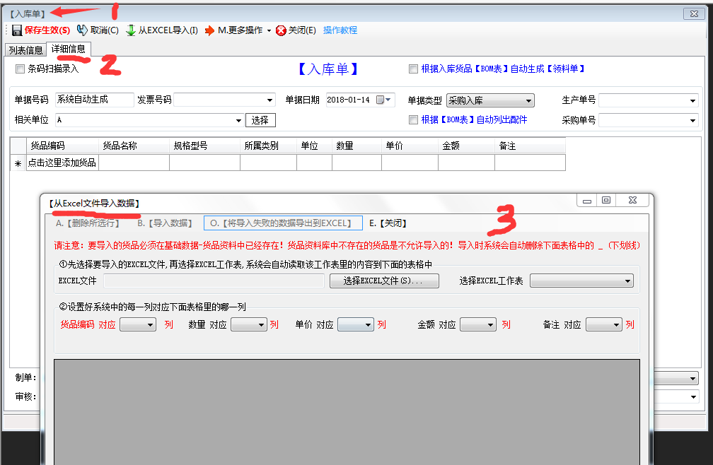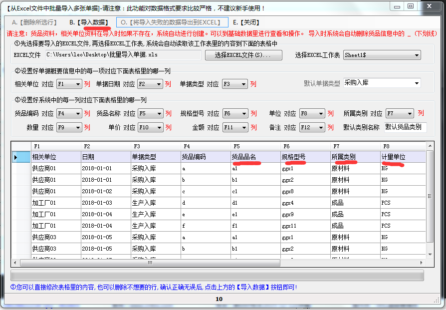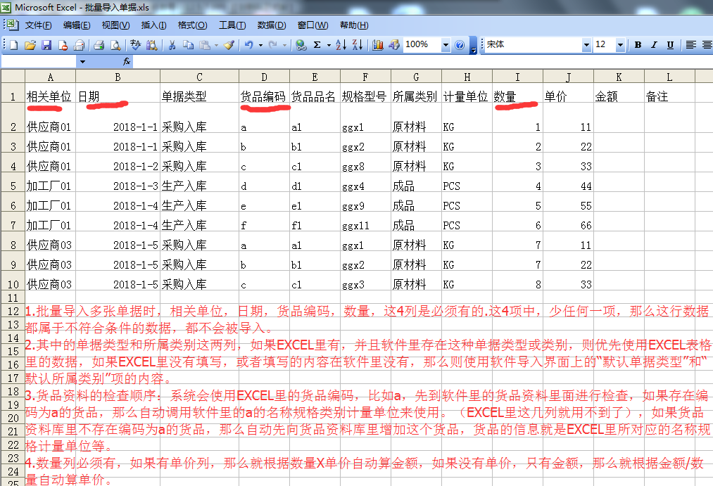 2.相關單位,日期,貨品編碼,數量這四列為必填項,必須有,其中任何一項沒有數據,則這行數據不會被導入。