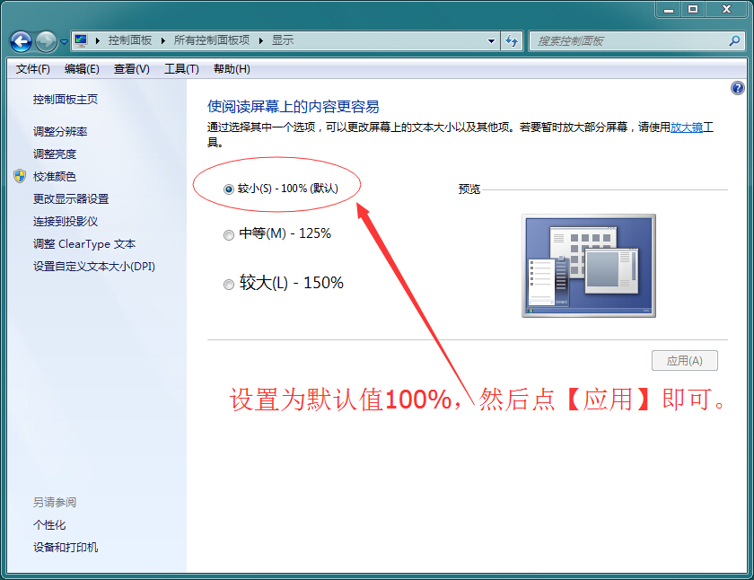 第三步:調整為默認大?。?00%),后點擊邊的【應用】