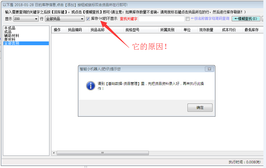 今天有個企管王ERP軟件的用戶在基礎(chǔ)數(shù)據(jù),貨品管理里,做產(chǎn)品的BOM表,選擇配件(貨品)的時候,遇到下面這個提示“請到【基礎(chǔ)數(shù)據(jù)-貨品管理】里先把貨品資料錄入好再來執(zhí)行此操作”,然后沒有配件可供選擇。