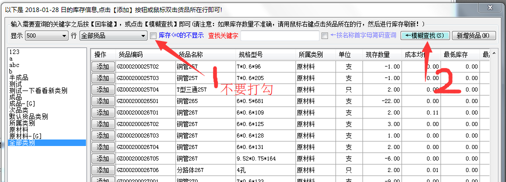 知道這些就簡單了,只需要把【庫存<=0的不顯示】前面的勾去掉就可以了。(去掉勾之后,再點一下右邊的藍色按鈕【模糊查找】)