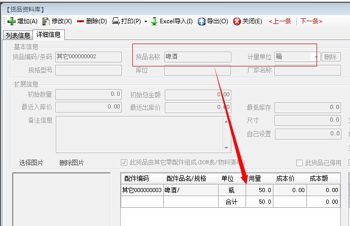 在箱為單位的啤酒貨品信息里面,建立BOM 表,選擇瓶為單位的啤酒貨品,用量50。