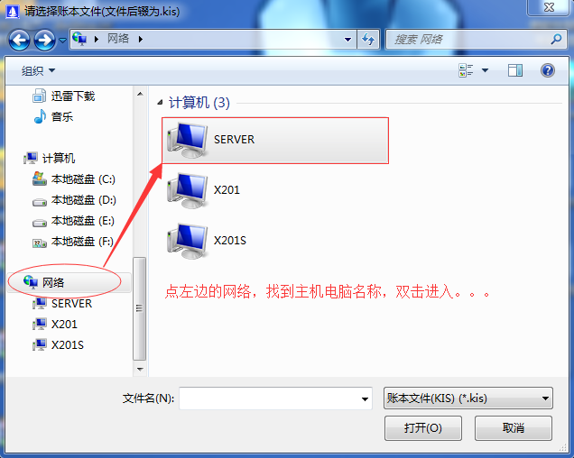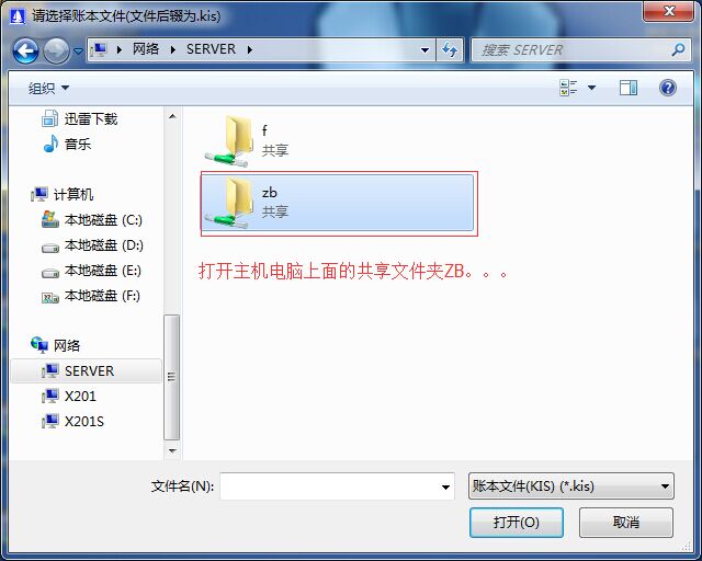 點(diǎn)左邊的網(wǎng)絡(luò),然后右邊找到主機(jī)電腦的名稱,雙擊它進(jìn)入,找到共享文件夾“ZB”打開,鼠標(biāo)點(diǎn)擊你要操作的賬本,點(diǎn)右下角的打開即可。如圖:
