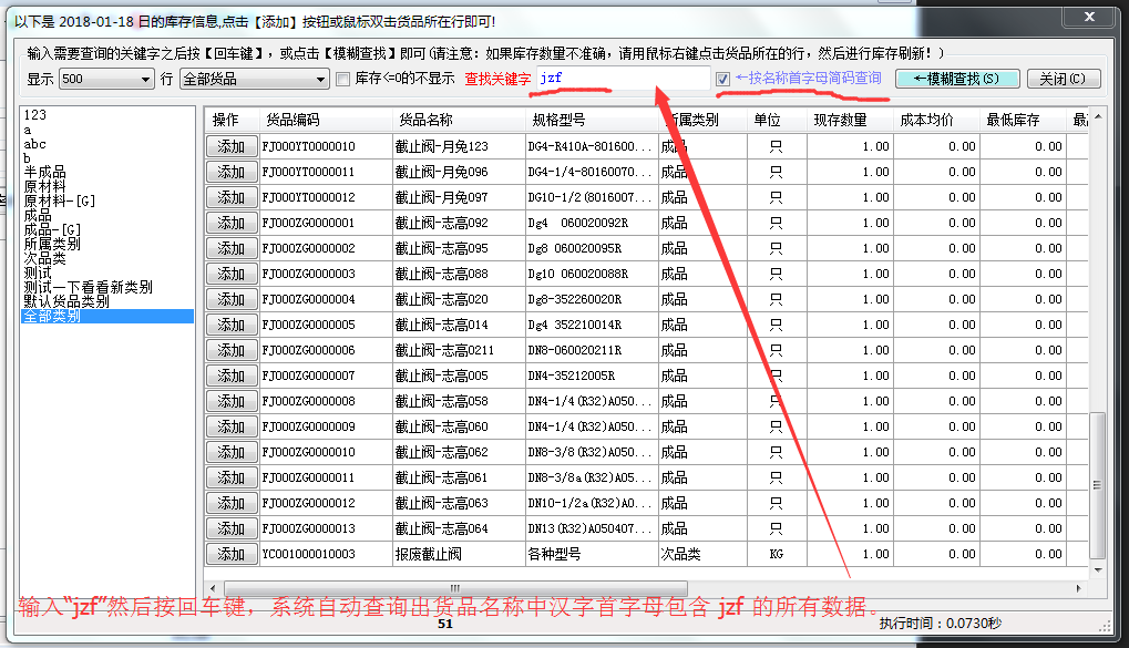 比如我要查詢名稱為“截止閥”的貨品,只需要直接在上面錄入 jzf 三個(gè)字母然后按回車(chē)鍵,就可以了。