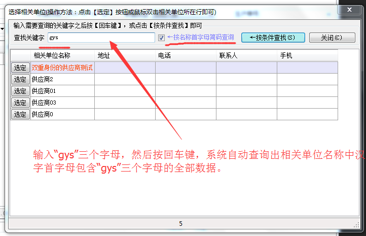 輸入“GYS”三個(gè)字母,然后按回車(chē)鍵,系統(tǒng)就會(huì)自動(dòng)查詢出相關(guān)單位名稱中漢字首字母包含"GYS"三個(gè)字母的全部數(shù)據(jù)。