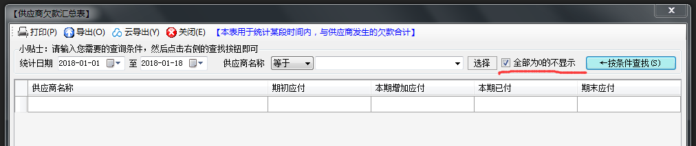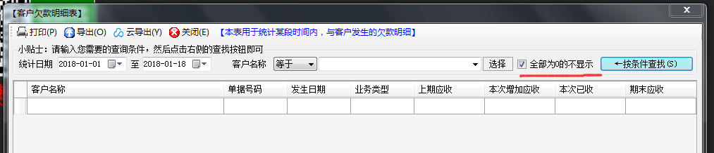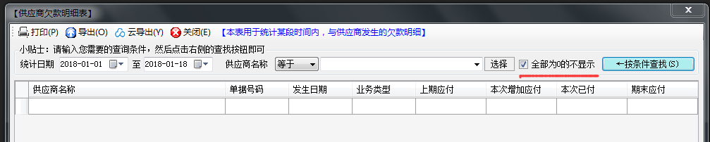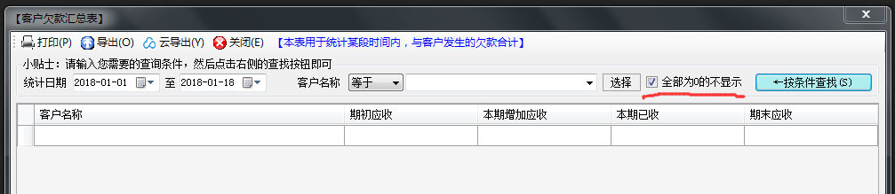 2.客戶欠款明細(xì)表,客戶欠款匯總表,供應(yīng)商欠款明細(xì)表,供應(yīng)商欠款匯總表,這四個(gè)地方增加了一個(gè)查詢過(guò)濾條件,可以過(guò)濾掉金額全部為0的數(shù)據(jù),讓界面更加簡(jiǎn)潔明了。
