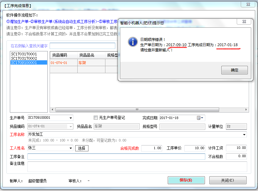 3.生產(chǎn)管理里面的生產(chǎn)工序完成登記保存時(shí)增加了一個(gè)日期驗(yàn)證功能,如果完成日期在生產(chǎn)單的下單日期之前,那么,不允許保存數(shù)據(jù)。