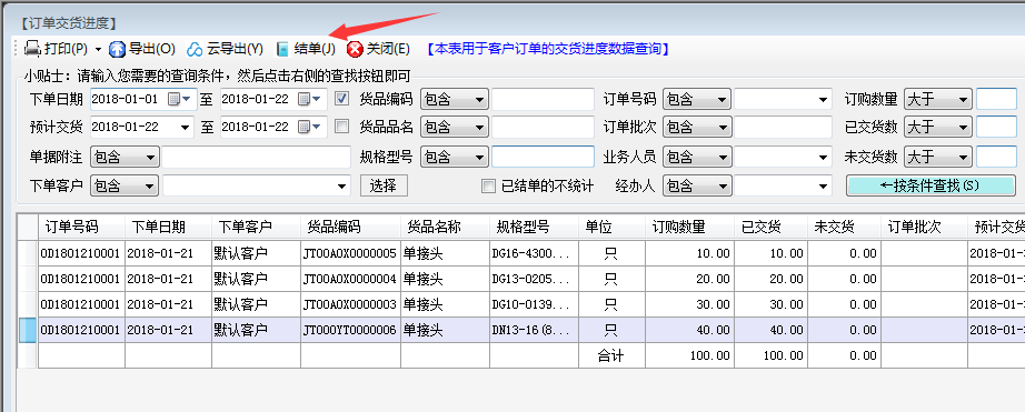 1.在客戶訂單交貨進度查詢表界面,增加結(jié)單功能。