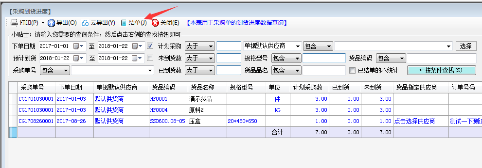 2.在采購訂單到貨進度查詢表界面,增加結(jié)單功能。