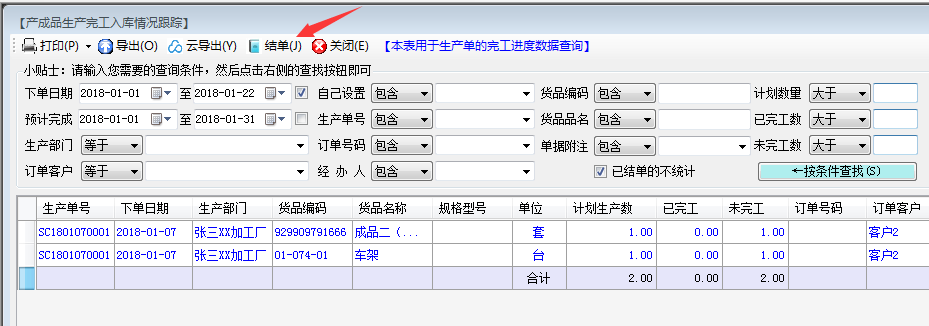 3.在生產(chǎn)單產(chǎn)成品入庫進度查詢表界面,增加結(jié)單功能。