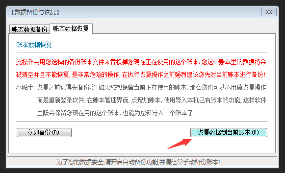 然后點擊【賬本數(shù)據(jù)恢復】選項卡上的【恢復數(shù)據(jù)到當前賬本】