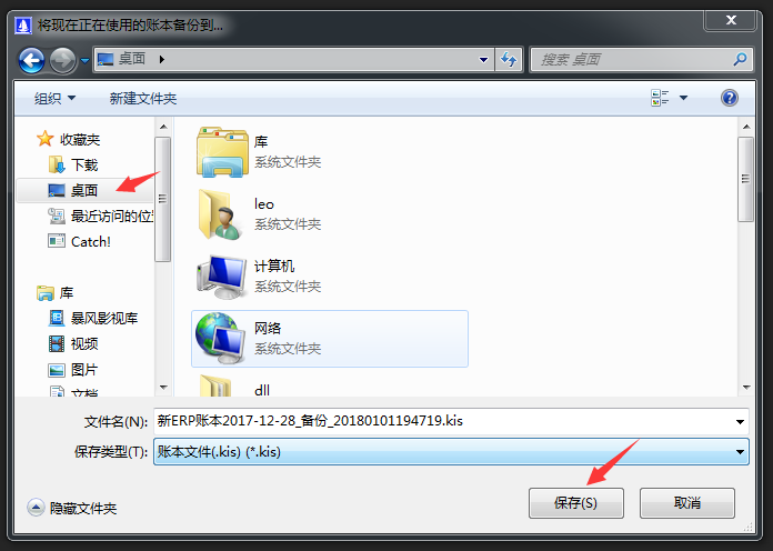 接著選擇好你要把賬本存放到哪個位置,之后點【保存】按鈕。(一般情況下我們直接把賬本放到桌面上就行,這樣方便復制)