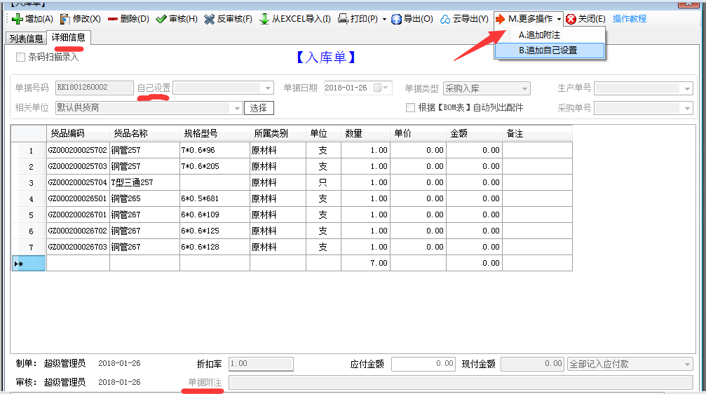 在單據(jù)的詳細(xì)信息界面(就是有貨品信息表格的這個(gè)界面)上,最上面有個(gè)【更多操作】里面有兩項(xiàng)?!咀芳痈阶ⅰ亢汀咀芳幼约涸O(shè)置】(如果用戶有改過自己設(shè)置項(xiàng)目名稱,那么這里的顯示會(huì)稍有不同,但是操作方法都是一模一樣的)
