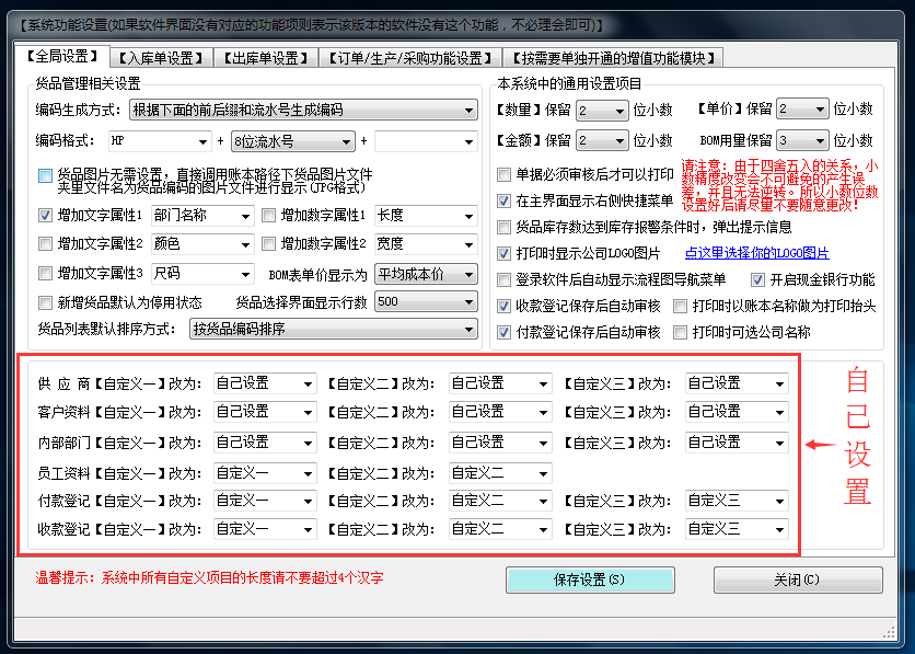 其它的,比如:客戶資料,內(nèi)部部門資料,員工資料,收款登記,付款登記,貨品資料,入庫單,出庫單,等很多地方,都可以進(jìn)行設(shè)置,有可能叫法不一樣,有的叫自己設(shè)置,有的叫自定義項(xiàng),有的叫自定義一。。。。等等,但是它們都是同一個東西,使用方法完全一樣。
